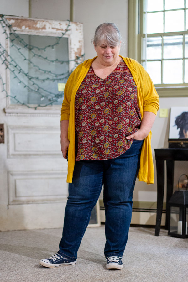 This is not what I’m actually wearing today. But I was trying on this shirt I got from Amazon Prime Wardrobe and figured I’d share the picture of that vs what I actually wore. I DID wear the jeans and Okey Dokey Yo shirt. Can you guess what I wore over the tee?? I’m sure you can.