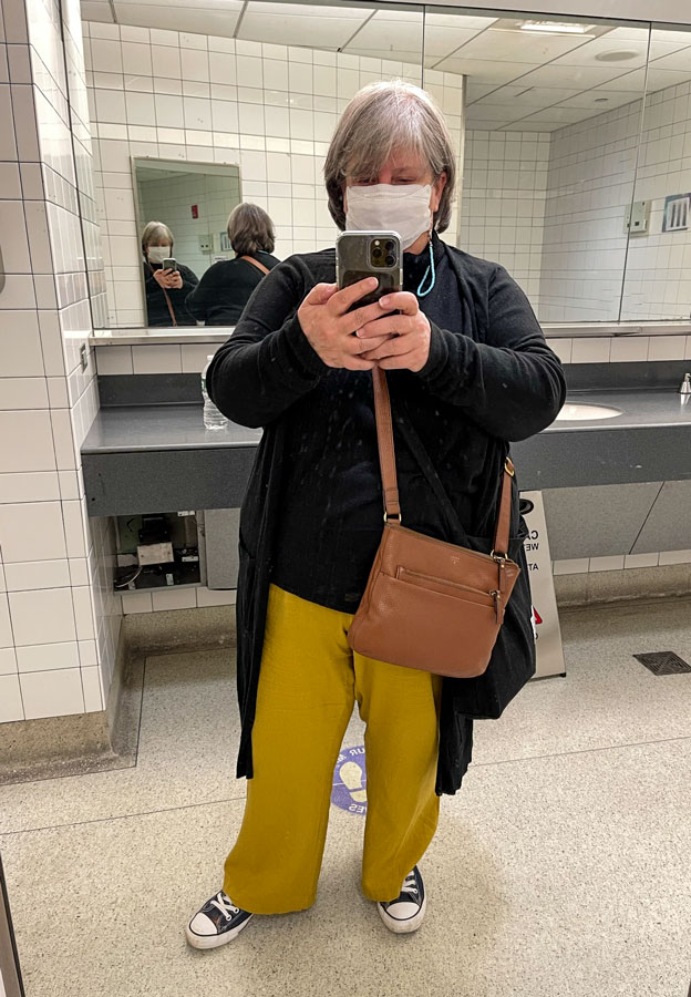 Airport Duds. Baggy linen pants w a turtleneck and lightweight cardigan. Sneakers, Purse and canvas crossbody carry-on for camera and in-flight entertainment (every charging and listening device imaginable, Korean textbook, notepad and Twizzlers.)