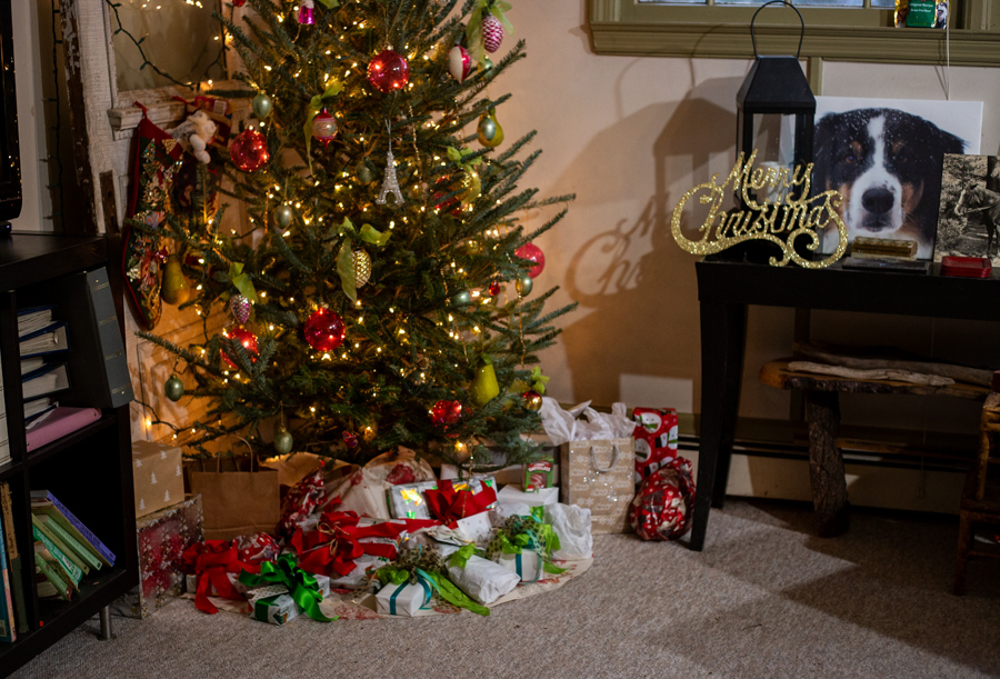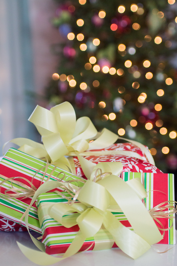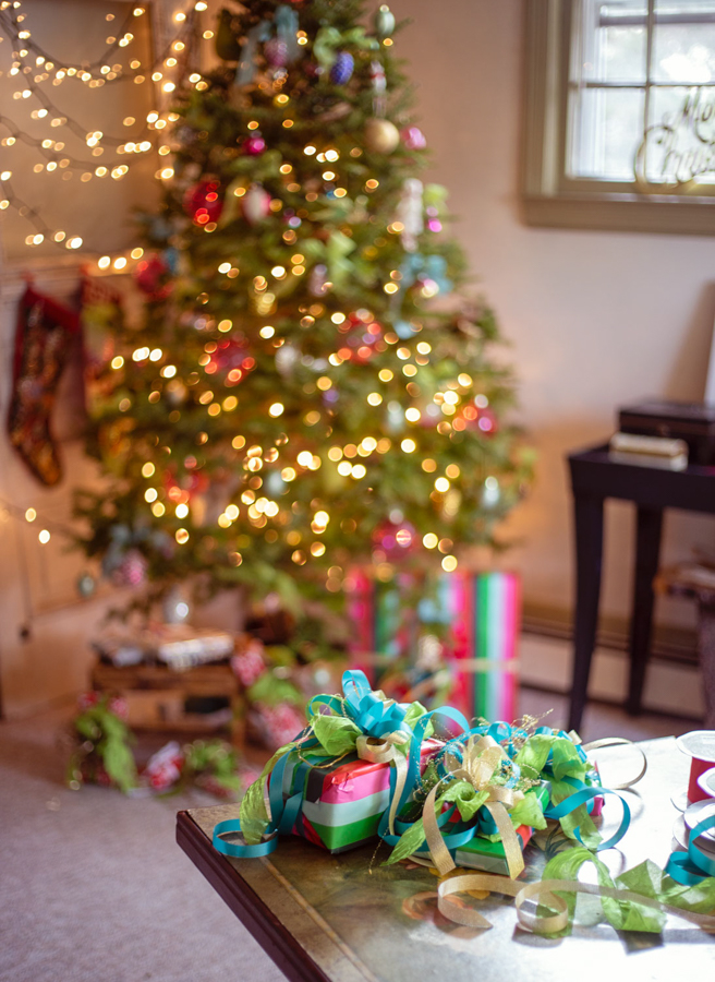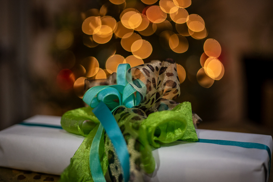 The traditional wrapped gift + Christmas tree light bokeh. It’s a classic.