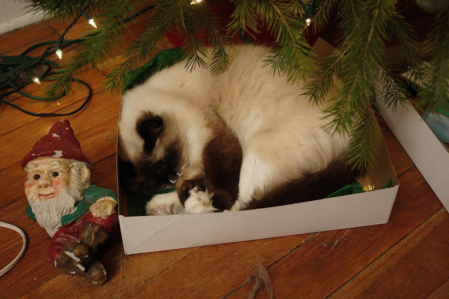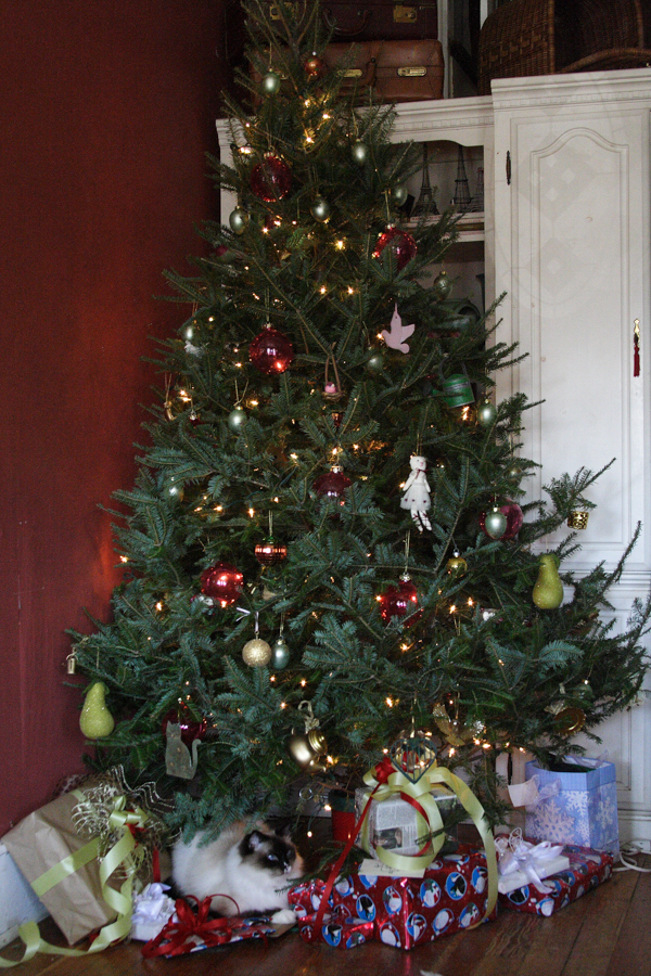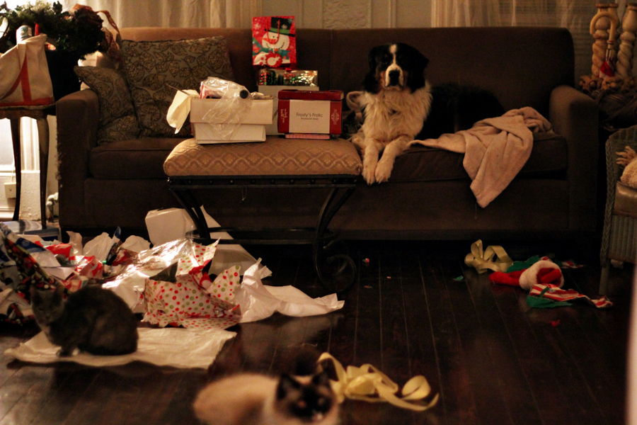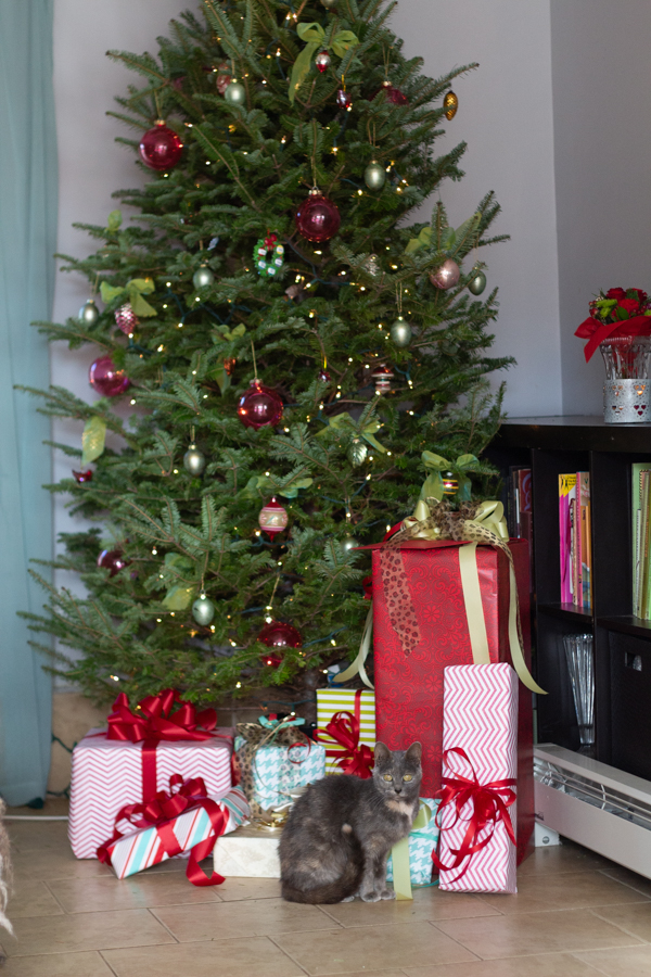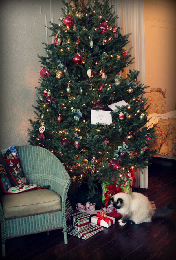 For me, hands down, that is Christmas. The twinkly lights. Wrapped gifts under the tree. A fragrant live tree. The glow of candlelight. The comfort and familiarity of the same decorations coming out year after year. The animals. Taking pictures. And the best part…my favorite person (Katie) spending the afternoon with me, opening stockings and gifts, going out for Chinese food dinner, then relaxing on the sofa later watching tv. With the animals. Taking picturses. By the glow of candlelight 🙂