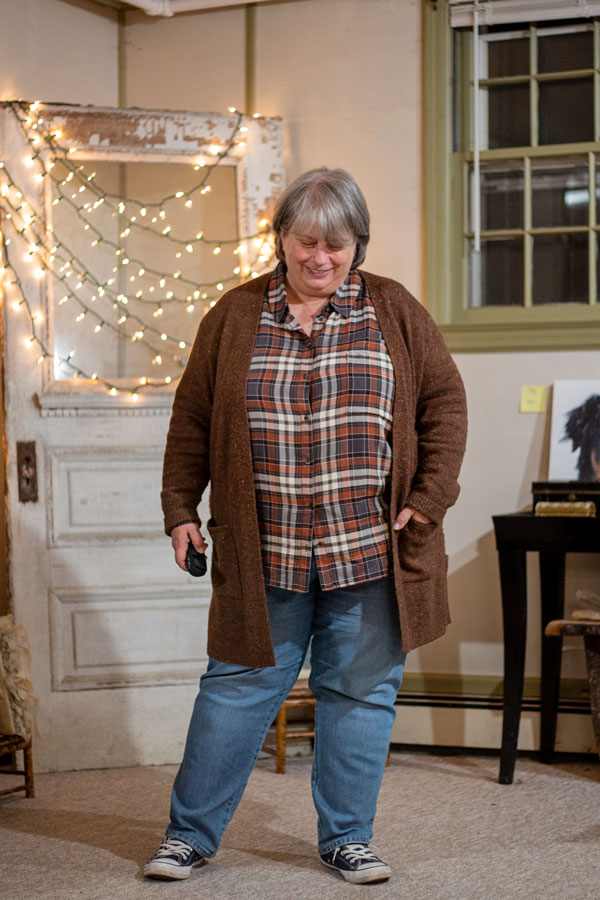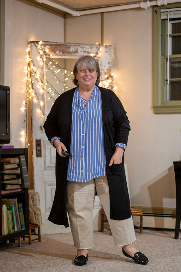 Basic formula: jeans, button-down, cardigan. Lather, rinse, repeat.