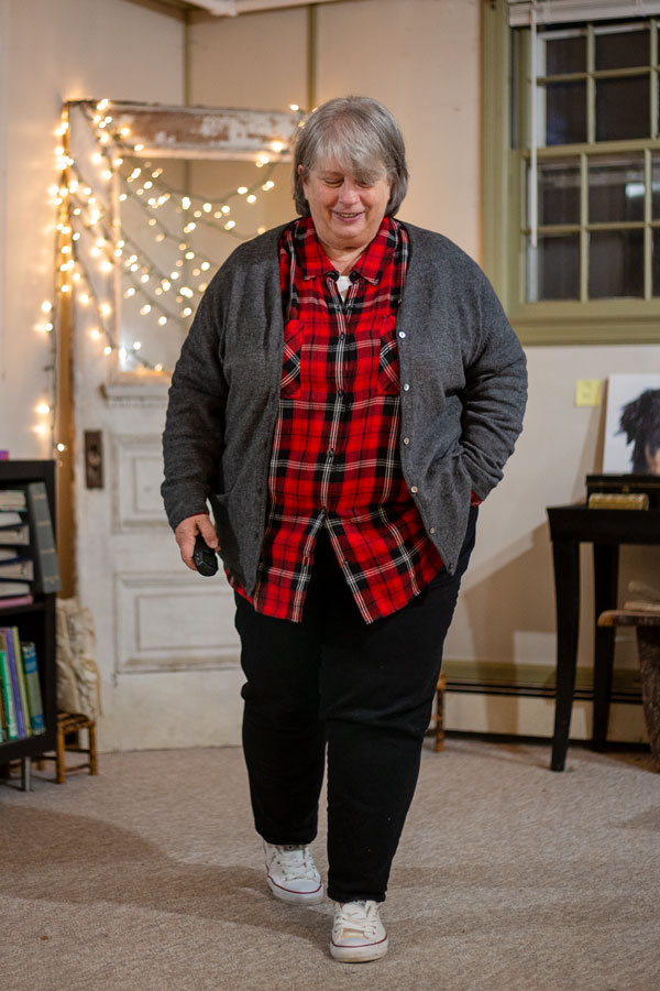 What I DO like about this outfit is the little triangle of white showing at the neckline of the tee underneath…and the white sneakers with the black jeans…connecting to the white tee triangle up-top. It’s a little sandwich of black and red between the white cookies, if you will.