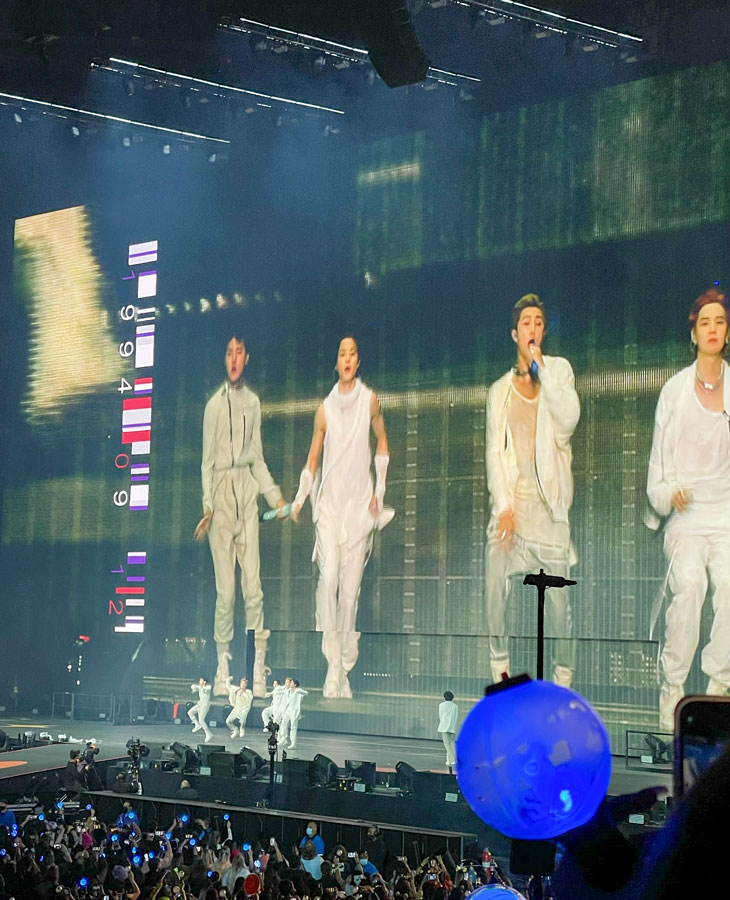 So I mostly watched them on the giant tv screen – and it was GIANT – the full width of the football field. So on screen they were GINORMOUS. But. Two things: 1) I ALWAYS watch them on a screen. I came to a concert to see THEM. Live. In-person. Close up. And 2) on screen, you’re watching Cameraman’s Choice. If he was filming Jimin singing when you wanted to see Hobi’s dance moves, well…you were outta luck. If you wanted to watch the choreo of the whole group but they were focused in on ONE member, well…yeah. You get the idea. Also, they used a lot of digital effects on the screen, like graphics and split screening, etc., which, to me, sort of was a distraction.