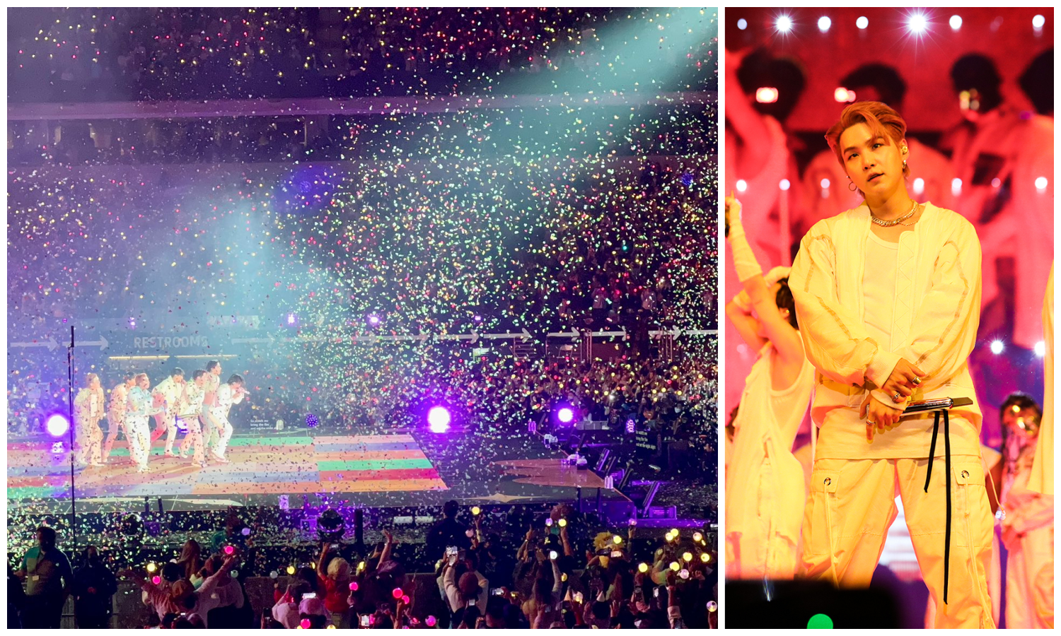 The show itself was a spectacle. Even if you didn’t know who the heck BTS is, it might be a fun show just to watch. Cuz they are FUN. And they look like they are HAVING fun. And that fun is contagious. The music, the choreography, the graphics on the giant screen, the surprise guest (Meghan Thee Stallion), the fireworks, streamers, giant balloons, set props: the giant sofa they sat on during Life Goes On and rolled around the stage…the giant trolley that drove around the entire stadium RIGHT UP CLOSE TO THE SEATS (and I could have enjoyed more if Tall Girl in Front of Me could have stopped waving her arms, cell phone, and light bomb for JUST ONE MINUTE so I could have had EYE CONTACT with Yoongi) (SIGH). All the things. It was a fun, happy, joyous, excited, grateful –experience? Ambiance? Environment?