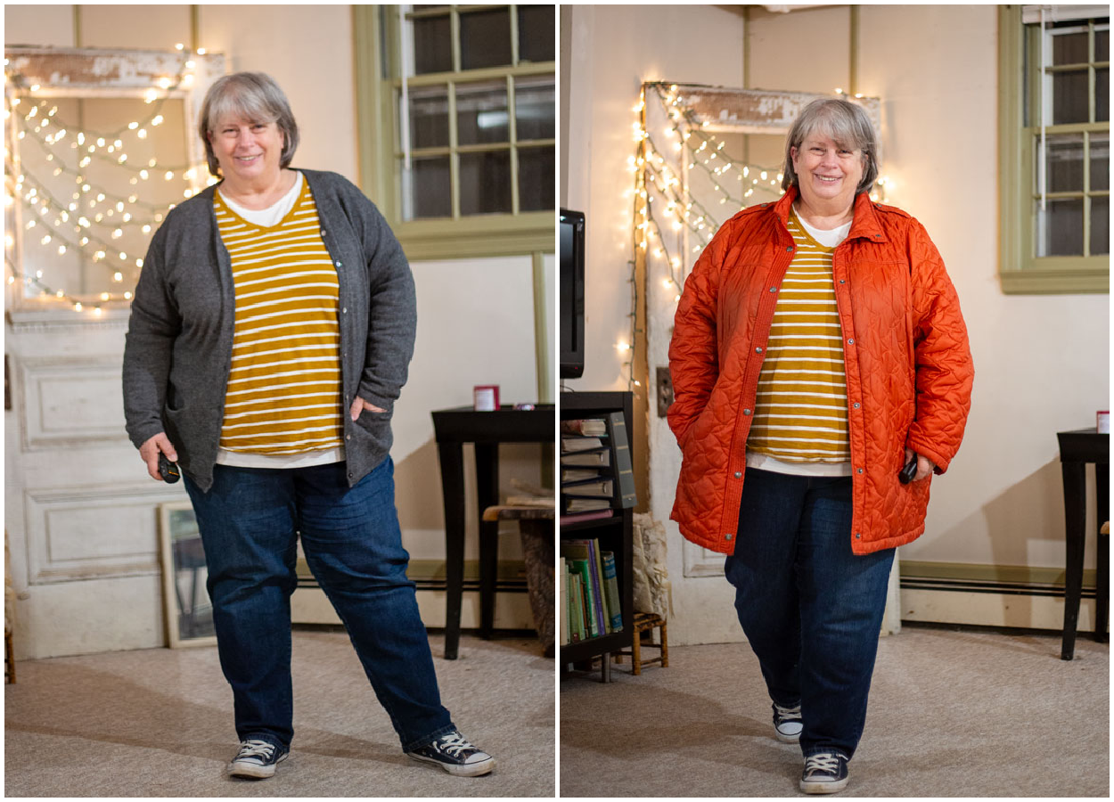 I love the charcoal grey with the mustard of the tee. I love the white crew-neck tee showing under the v of the mustard tee neckline. I love the mustard with the dark wash jeans. I love the charcoal grey with the dark wash jeans. I love the converse with this hip-length cardigan – I feel very “modern academic.”