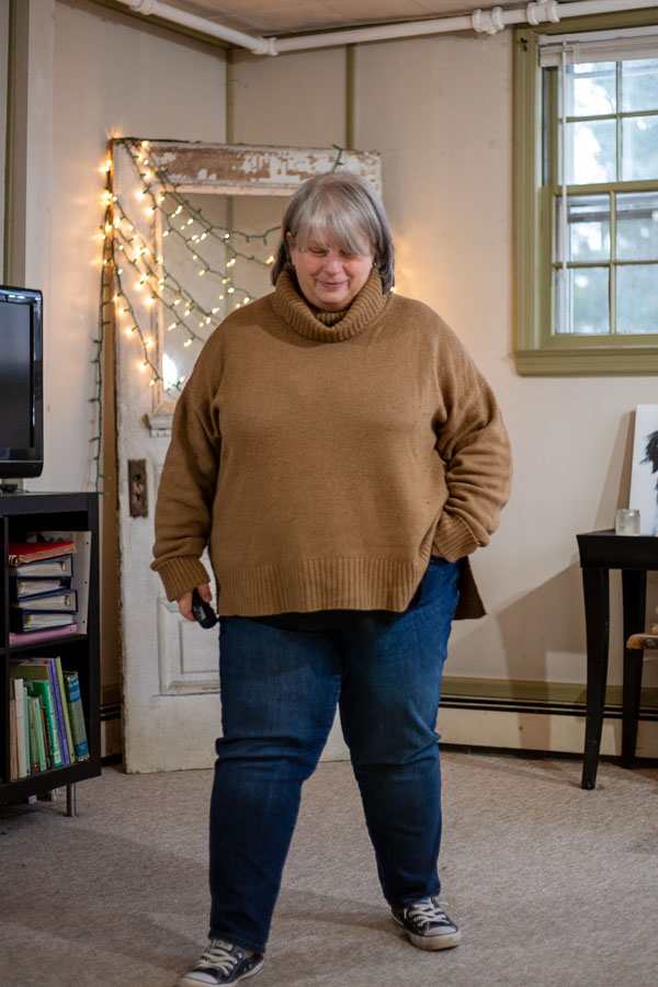 I am WEARING three pieces, but you can’t see the black tee-shirt under the sweater. I wore it for function, not form 🙂