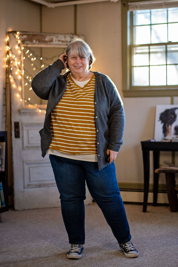 THEN. I love the mustard striped v-neck tee. I love the little bit of white showing in the v from the white tee below. I love the mustard with the grey. I love the mustard and the charcoal grey with the “just faded a little bit” dark wash jeans.