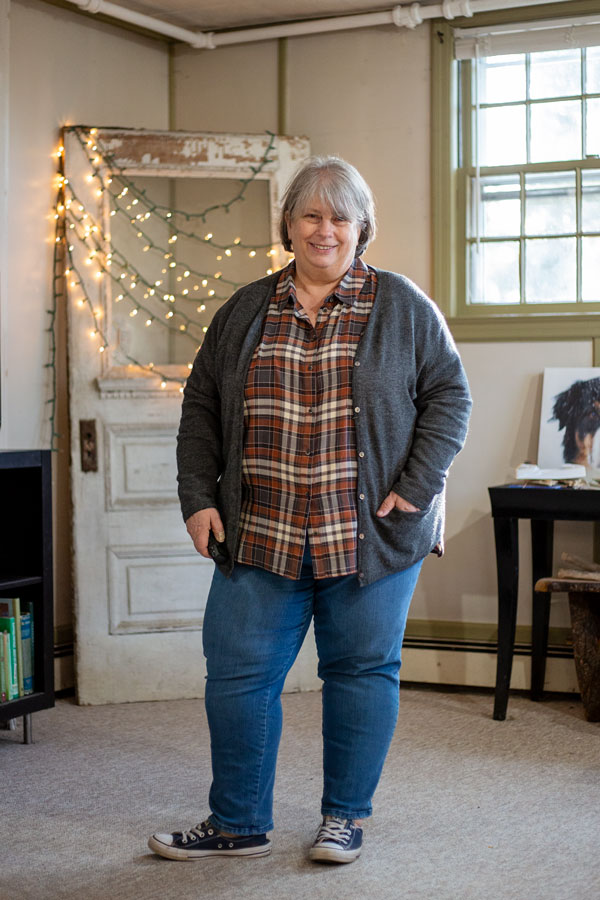 I don’t think I’ve worn this plaid button-down with this grey cardigan before…and I really like them together. I’d been waiting to wear them til a pair of taupey-beige jeans magically appeared in my closet. But I’m running out of cold weather so just went ahead and wore them with the medium wash jeans. And don’t hate it.