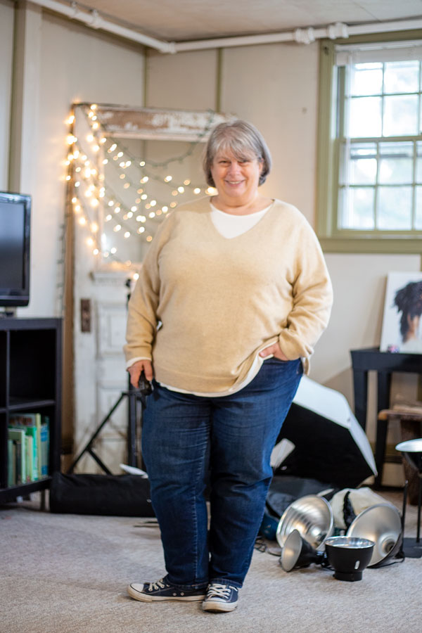 Meanwhile, I’m still getting dressed every day. Cashmere v-neck, long sleeve tee, last year’s size jeans. Oh I’m going with the flow all right in THIS comfy outfit.