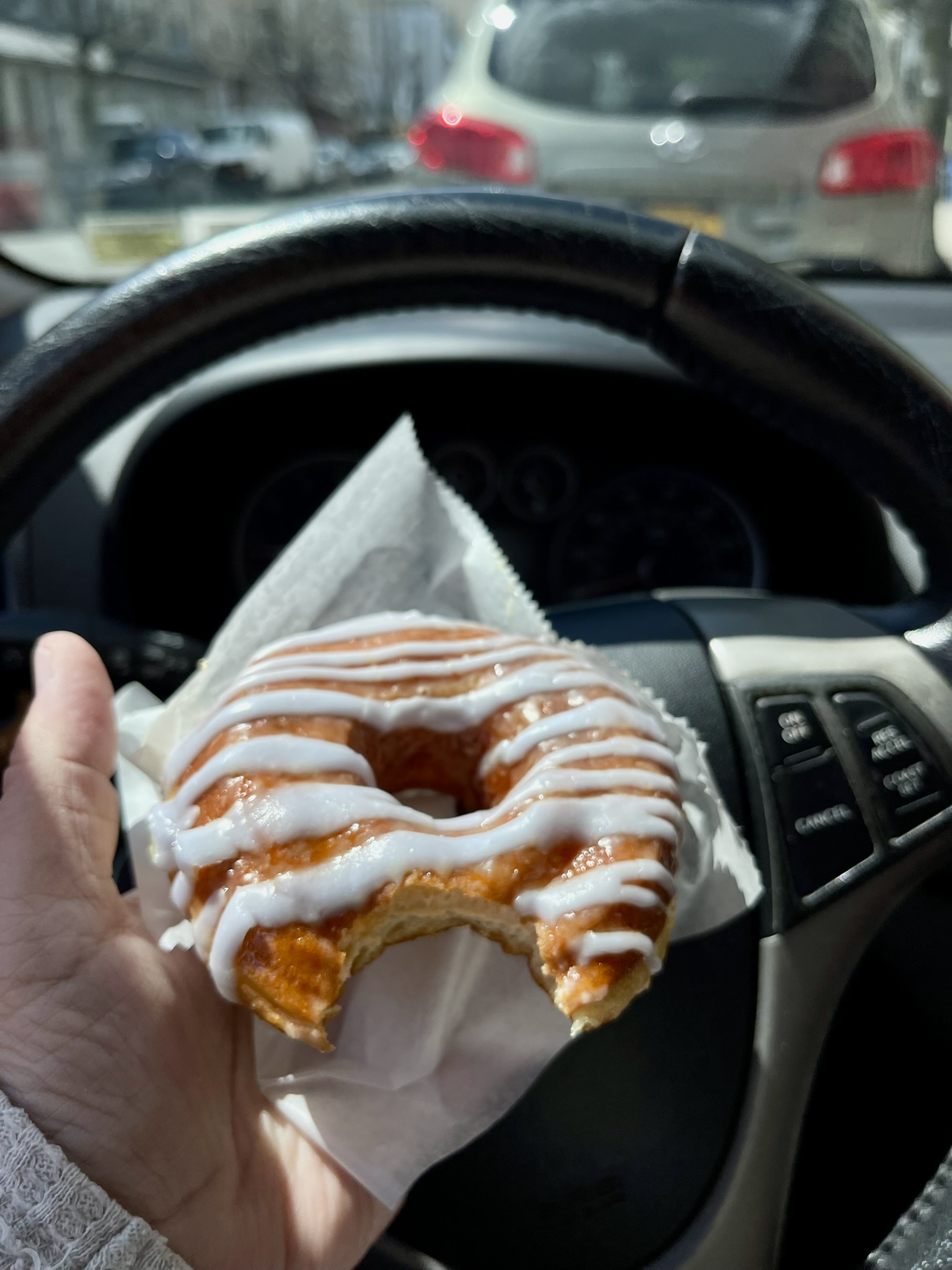 Little-bit-funny story, when it was my turn, I said “I’d like a lemon lavender, an almondine, and a butter rosemary,” and the young woman behind me in line goes, “Oh! I’m getting the exact same thing!” Which I thought was very random. I said, “we’re doughnut sisters,” we smiled, and I left. That was pretty much the extent of my human interaction for the day. Just the right amount 🙂