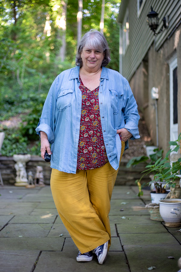 Love that print top with the mustard pants. I see a warm day with just the top and the loose pants and picture comfort.