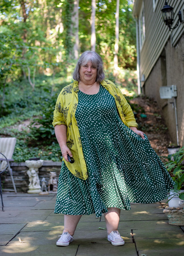It’s Green Dress Day (aka Hump Day). Just changing it up a little with the chartreuse (which I know sometimes reads as yellow on camera, but trust me, it’s chartreuse) over top. It’s so floaty, it’s almost like a kimono. With buttons.