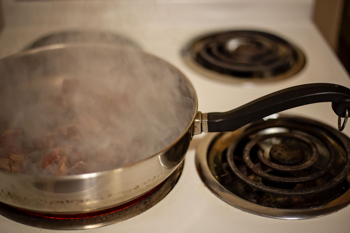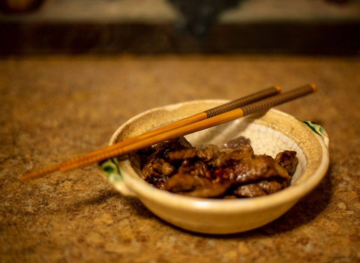 The cooking part is FAST. I put my crappy aluminum skillet on the stove and set the heat to high. When it’s super hot (a drop of water jumps and sizzles), I turn on the overhead fan and dump in the steak cubes (I’ve drained the excess soy sauce off in a strainer at the same time I turned on the stove burner. But you don’t want any extra liquid/moisture in the pan cuz you want the meat to sear not sautee). It’s gonna smoke. A lot. Hence the overhead fan.