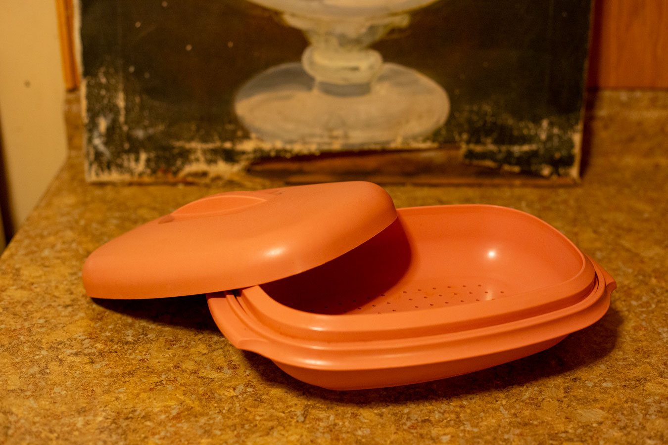 The tacky pink-turned-orangey-pink Tupperware 3-piece steamer. I got this for a wedding shower gift in 1989. I have used it exactly 12,974 times in the past 34 years. You can use it just as a regular lidded heating-up-container-thing, but when you add some water in the bottom part and then use the reticulated middle piece to hold the whatever: frozen vegetables, leftover pasta, reheated rice, etc, it’s a workhorse. I just throw stuff in it and put it in the microwave. Things heat up with overcooking or drying out. You don’t have to babysit it. The alternative would be a pot or pan on the stove, but then the food is going to overcook and stick to the pan and even with the Tupperware scraper, who wants to do that job if they don’t have to?? Food just slides right out of here. It’s a mini-miracle. In 80s pink.