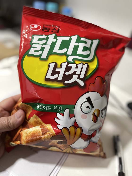 Thinking about starting up again with my TikTok…I’m starting to record some “bettye tries korean stuff” videos…I THOUGHT this was going to be spicy (red background + angry bird = SPICY in my mind, but no no, it was sort of bland “fried chicken coating” flavored. Don’t really recommend. The name is Chicken Leg Nugget.