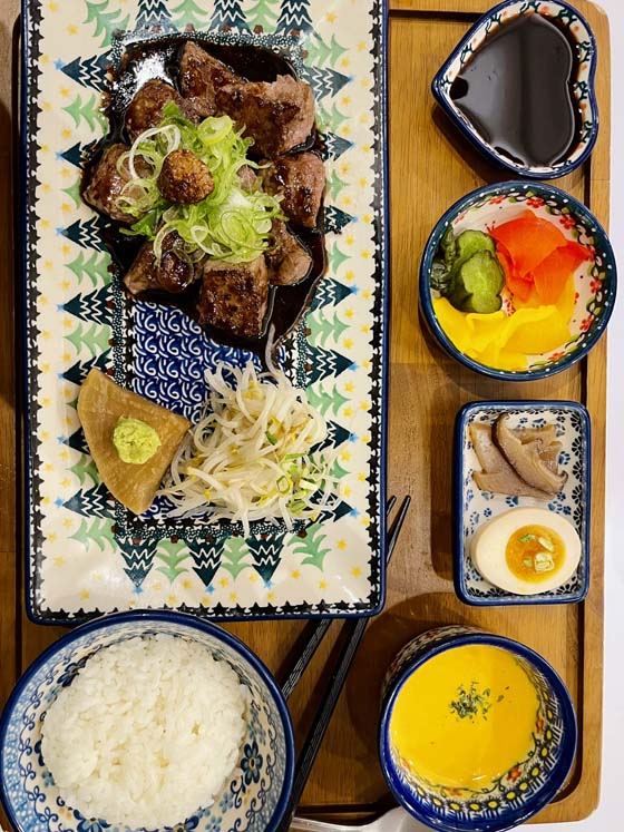I went back and forth all week whether I should keep our standing Thursday night “go out” appointment because of how poorly I’d been feeling (I was still not really eating normally). But when he texted “can we meet tomorrow,” I was…YES. YES WE CAN MEET TOMORROW. So we made a simple plan to just meet at a pajeon (vegetable pancake) place near me. But over the course of my 4-hour class I became RAVENOUS and decided I wanted MEAT BEEF STEAK 고기 – and after some texts during class break we decided on a Japanese place also close to me, but where I have had very good “steak bites” before AND a delicious sweet pumpkin soup.