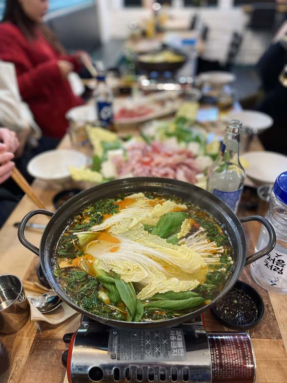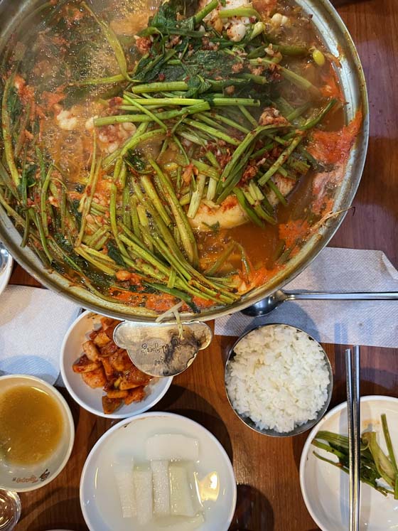 Anyway, if you saw it, “minari” is the name of the grass the family was growing for sale. I had never had it, I just knew it from the movie. A little backstory: when I was little and played horse with friends, we would “graze” around my yard on all fours, looking specifically for the tall stalks of what I always called “onion grass” (essentially like wild scallions), and those I (horse me) would actually eat, snuffling my muzzle through the grass in search of the tastiest stalks. That was like 58 years ago. This night, I picked out a couple strands of the boiled minari from the soup pot with my chopsticks and took a tentative bite. Instantly I was back on all fours in my yard, chewing on wild onion grass – it was that! The taste was exactly the same! Ha. I shared tthis story with Hyungun and I think we has a little puzzled, ha ha. But yeah. Minari. ha ha.