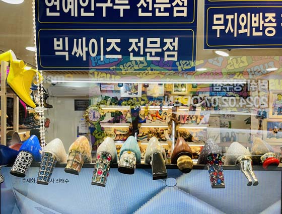 Yes, that’s a shoemaker’s window – that area is called Seongsu, it used to be very industrial with a lot of snow manufacturers, and there are a just a few holdovers remaining. It’s sort of like Seoul’s Brooklyn. And I don’t know if people actually wear those or if they were just an attention-getting display…but I bet someone somewhere is wearing them and loving life π