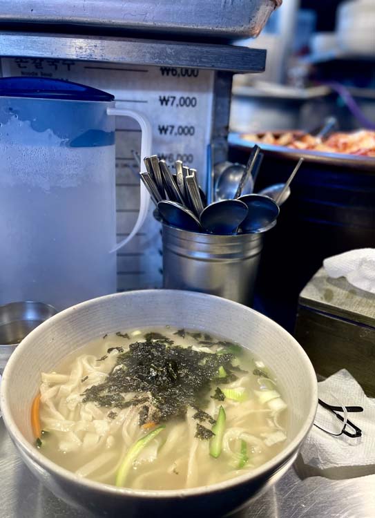 We had kalguksu, which is Korean Knife Cut Noodle Soup. When you sit down, the ahjumma rolls out fresh dough and cuts it into noodles in front of you, then they go straight into the broth and it’s in a bowl in front of you in less than five minutes. It was So Good. It’s a clear broth, but not bland, I’m not sure what was flavoring it, but the fresh noodles had a pepperish (like black pepper) flavor that was very nice. It’s a giant bowl for 8,000won ($6) and it was delicious.