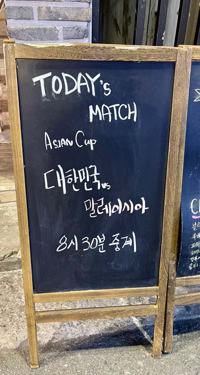 After that, since it was SO COLD, we headed back to Kondae, near me, to go to a bar that was showing the Korea vs Malaysia pre-lim game of the Asian Cup – YES, your girl is now a fledgling sports fan. Well, soccer. Well, KOREAN soccer (shocker). It took us going into three bars to find one with some available seats…as this was a pretty important game for South Korea. We had some drinks and appetizers and sort of watched the game. The tvs were in the other room, so when we’d hear Big Cheers or Sad Groans, we’d crane our necks to see what was going on, but…other than that we just talked.
