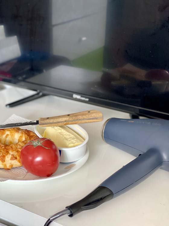 Life Hack du Jour. I forgot to take the butter out of the fridge in time to soften it for spreading on the bagel…so I used the hair dryer to soften it up šŸ™‚