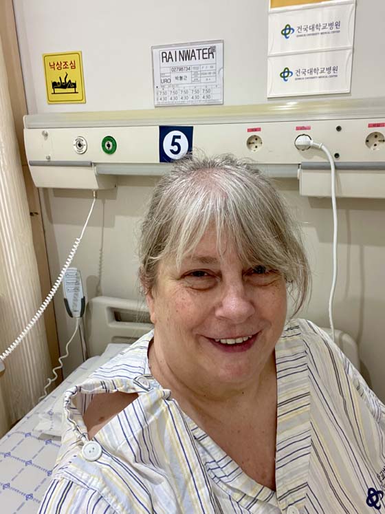 I’m writing this a few days later. The procedure was Thursday morning. I think I went for x-rays beforehand. Just seemed like once things started moving there was a lot going on. The interpreter met me outside of surgery and between her and three other nurses they explained to me what was going to happen…then I went in, they hooked me up to a bunch of things…and just as the doctor was putting the sleeping gas mask on me he asked me a question…I thought he was asking me if I spoke Korean and I said “jokum” (a little) and they all laughed…so I really have no idea WHAT he asked me. And then I was out.