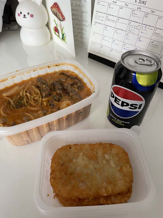 Magnificent dinner after getting home from hospital. Like a slightly spicy rose cream sauce pasta with rice cakes and big fluffy mushrooms…3 potato pancakes…and NOT the Coke I ordered, but a Lime Pepsi Zero (??).