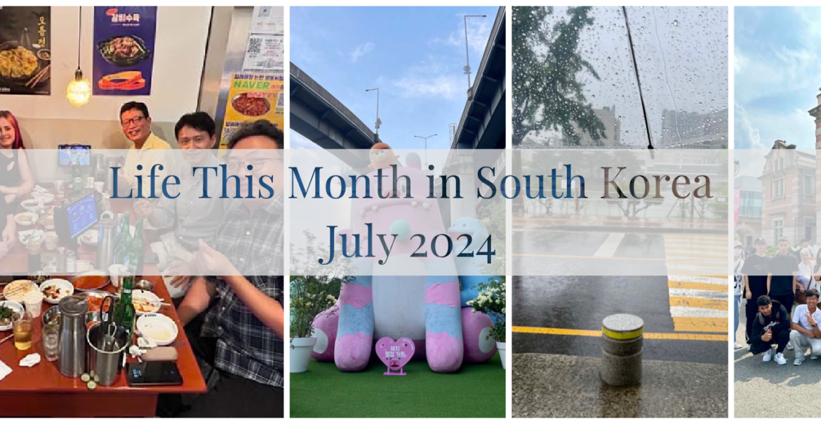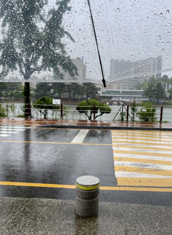 * When they say the end of June to the end of July is the rainy season (Jangma) in Korea, THEY AIN’T KIDDING. It rained like five out of every seven days I’d say…and HEAVY rain. I don’t live in a flood-prone area, but I was constantly getting alerts directed at people living in low-lying areas or near cliffs, etc, to GET OUT NOW. There were pictures of cars driving down the street and in a matter of minutes, being almost submerged in rainwater (HEY, THAT’S ME). For me it just meant having to keep my window closed almost all the time (the room would get soggy within like 15 minutes if the window was open even a crack) and having to carry an umbrella (plus crutch or cane) every day when going to class.