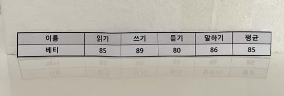 My midterm grades, from left to right: my name, reading, writing, listening, speaking, overall average