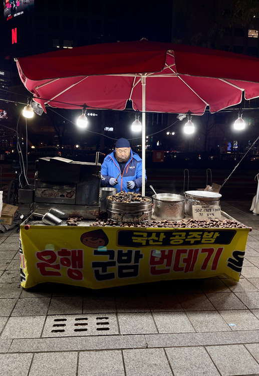 Only to find, when I arrived there at 10:10…that they turn the lights off at 10pm!!! WTH? You’d think on Christmas Eve, of all nights, they’d stay lit a LITTLE later! So I walked by all the vendors on the sidewalk, looking for a hotteok stand – that’s my favorite winter food truck delight. Freshly deep fried dough filled with melty cinnamon and honey and other yummy things. I could SMELL them…I just couldn’t FIND them.