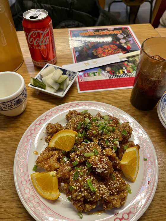 I had a lovely Christmas Nap and dragged myself out of bed around 6:00 for a 7:oo dinner reservation at a Chinese restaurant I’d found that had some American-Chinese dishes (they had me at Orange Chicken). The food was good, and I even won a 50,000w gift certificate in a little contest they had…so when I go back next time, it’s all paid for. Nice.
