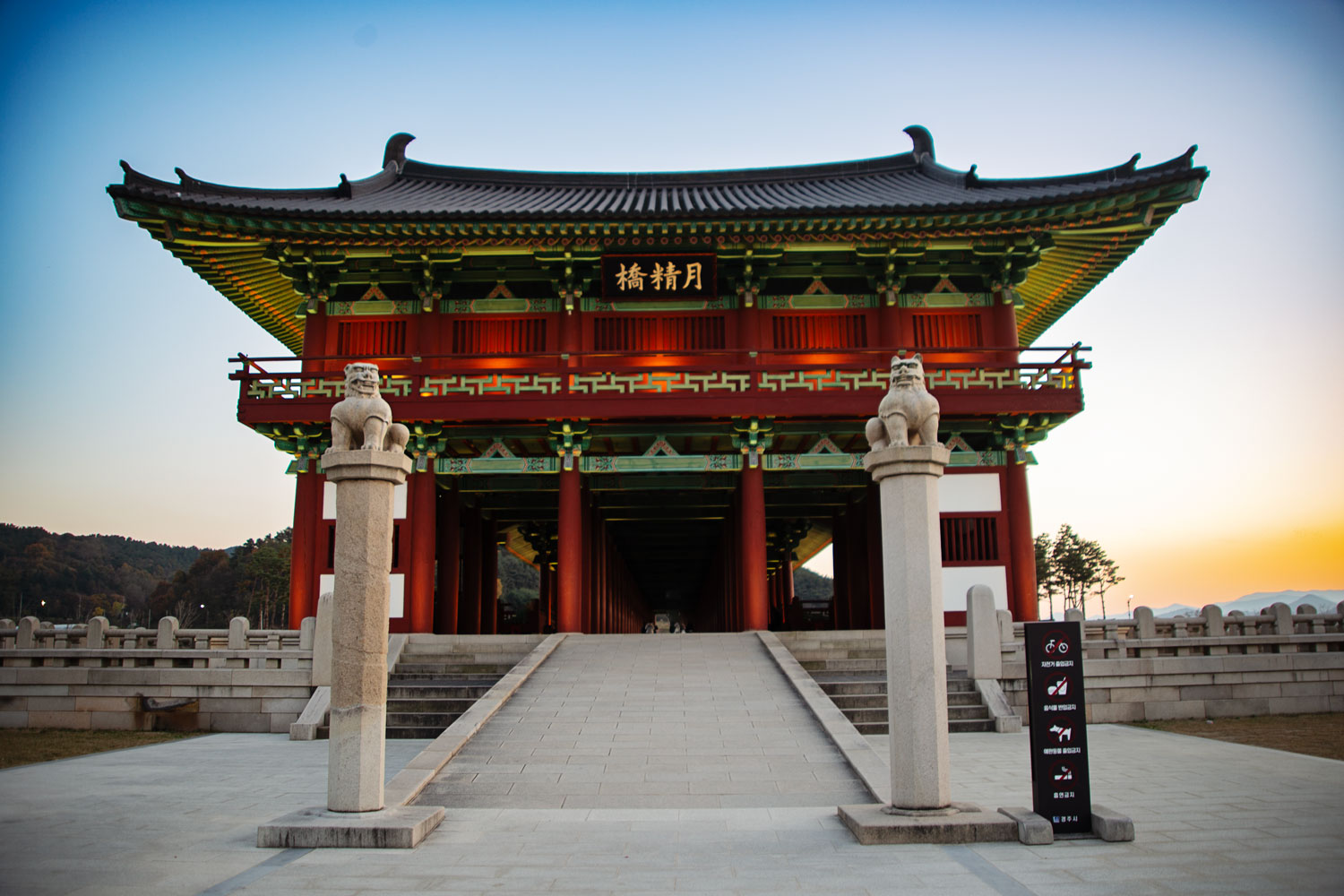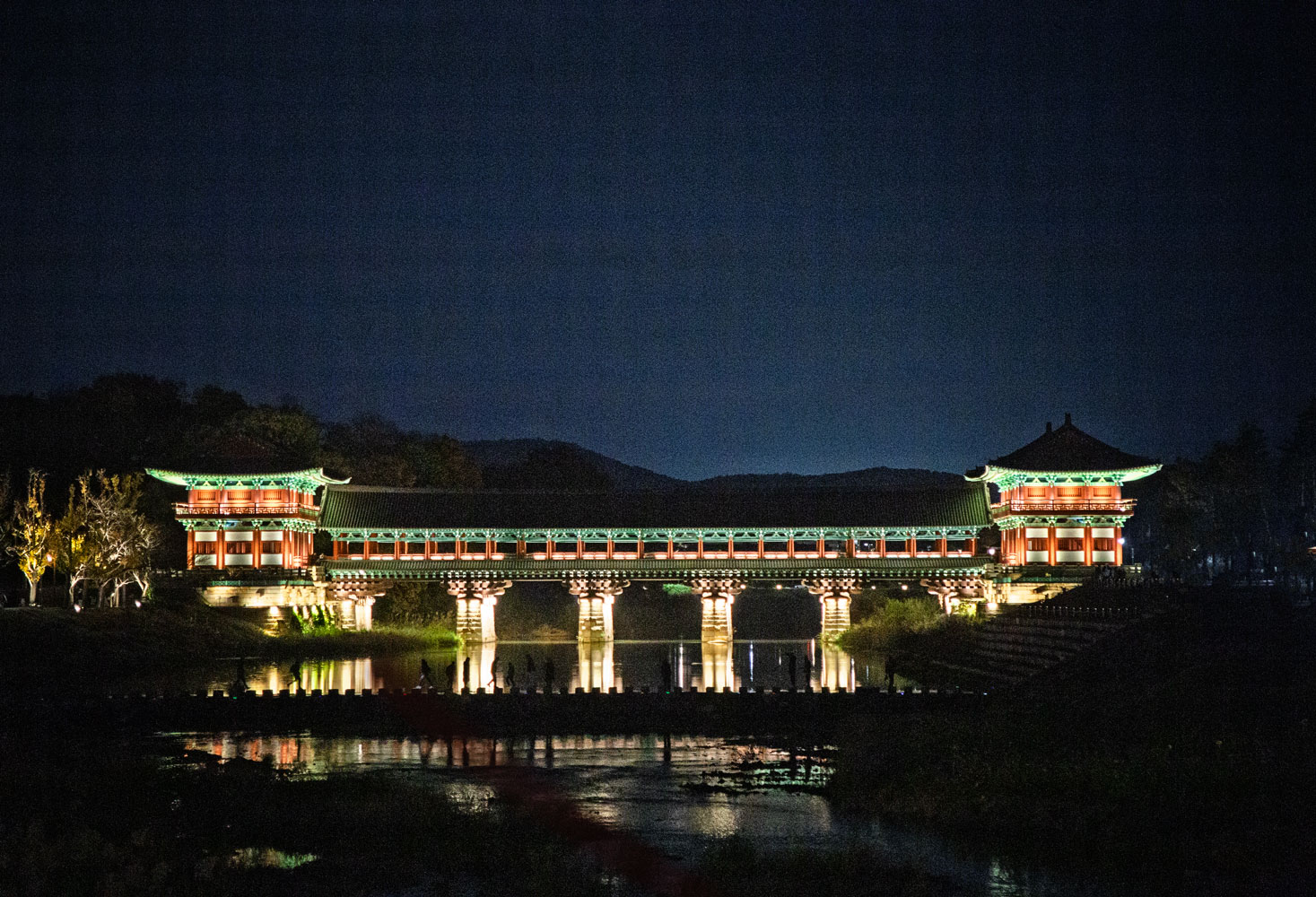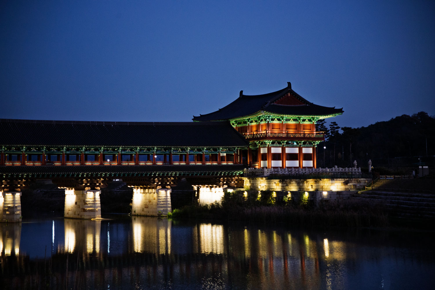 After exploring the grounds (and taking a lot of photos), I headed back to the hotel for a quick rest, then set out again for dusk at Woljeonggyo Bridge. Reconstructed to mirror its Silla-era (57 BCE-935 CE, aka A REALLY long time ago) glory, the traditional wooden bridge lit up under the cobalt sky was like something out of a painting. I spent a long time photographing the shifting twilight hues, and a kind local even offered to take my picture—a sweet moment to remember.
