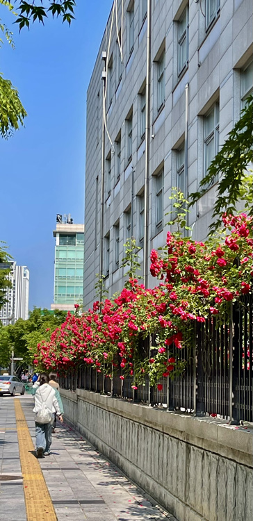I headed out this morning on an easy mission. An apartment building being taken over by climbing roses in the neighboring town, Seongsu, and I wanted to take pictures. Then to a donut place I’ve been wanting to try for ages. And on the way home stop at the phone store to see about extending my phone number the rest of the time I’m here.
