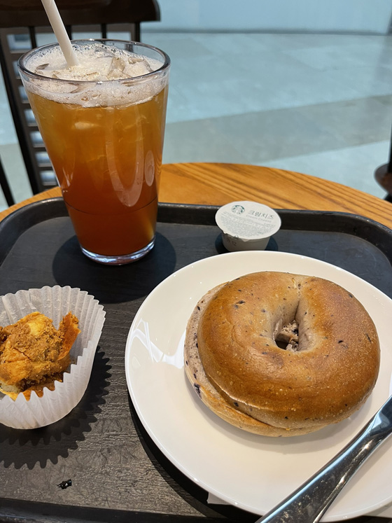 I went with my school/building friend, G, to get his hair cut. I had a couple things to get in the mall so I didn’t mind going along with him. But ArtBox, where I was going to get new pens, was closed…and the market didn’t have the roasted chicken I was looking for, so…I was forced to sit in Starbucks with a bagel and a Grapefruit Honey Black Iced Tea. Life’srough.