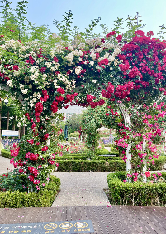 My alarm was set for 6am…but I woke up at 5am to lovely light…so went ahead and got up and headed to Daeyeonsan Rose Garden. I started out on the bus, but the second bus never came (sometimes the app says the bus will arrive in just a few minutes…but the signage at the bus stop says it’s going to arrive in like 52 minutes. I’ll wait for the earliest one, but if it doesn’t come, I reroute myself or sometimes – like today – end up in an uber). The driver got me to the general area, not understanding I wanted the rose gardren, not just the park entrance. And I did not realize the rose garden was up a hill. And stairs. Sigh.