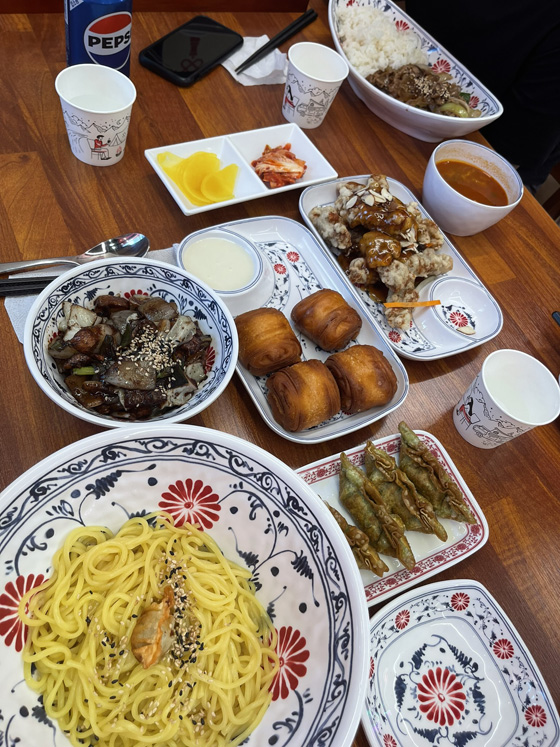 I had jjajanmgmyeon (noodles with black bean sauce), G had chicken something, and K had…something with veggies and rice. And dumplings and something like bland zeppoles with sugar sauce for the table.