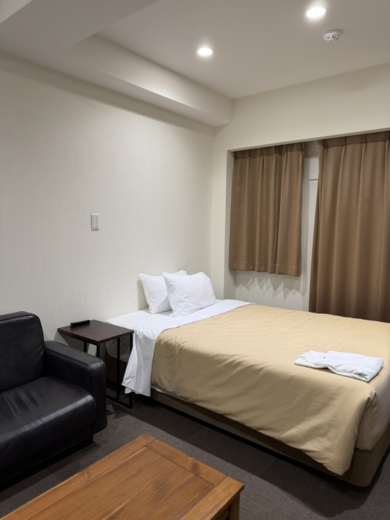 Sadly, while the room was larger, and had not just a bed w poofy comforter, but also a desk, a SOFA, and a KITCHEN…the WINDOW faced right up againts another building, so Zero View, Zero Light. I kinda feel like they should tell you that. You had to have the Ceiling Lights from the Sun on 24/7, which was pretty unbearable. It made the whole room feel basementy and unpleasant to me.