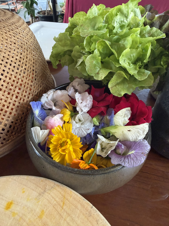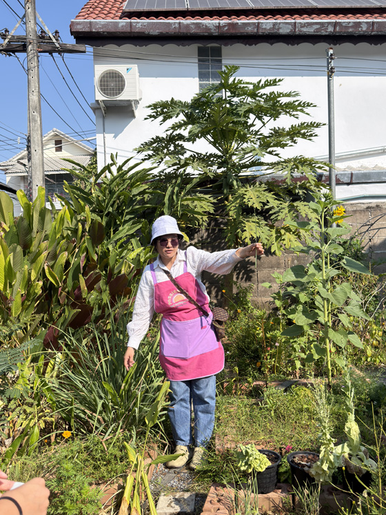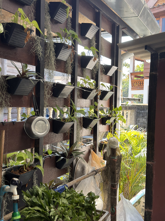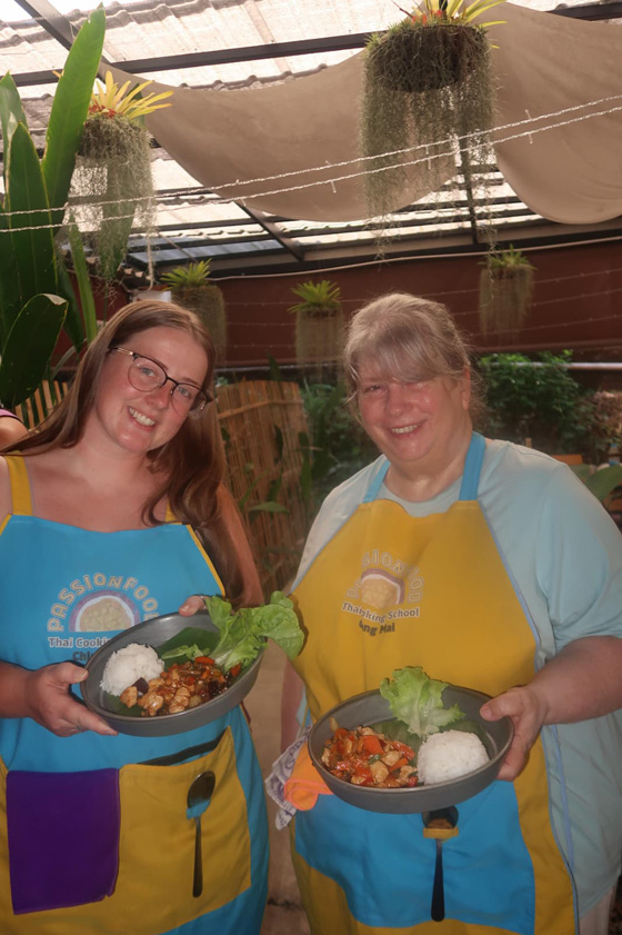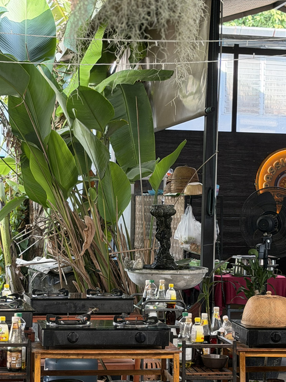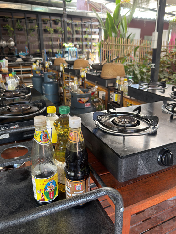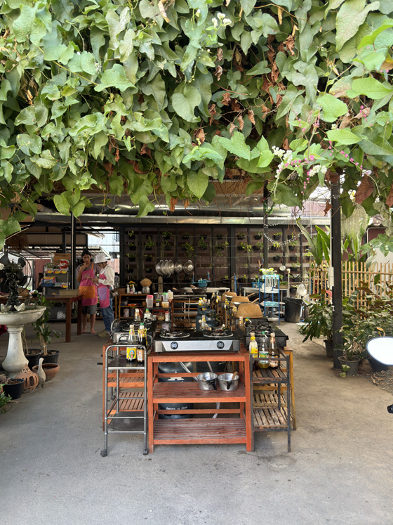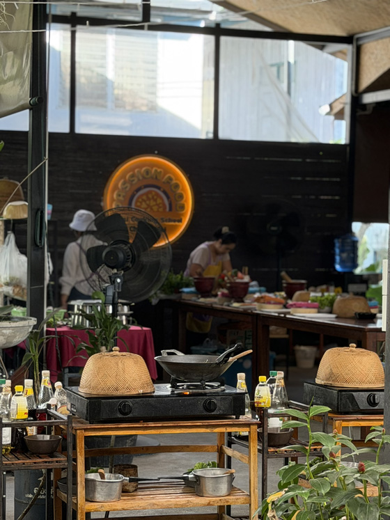 The class was at Passion Food Thai Cooking School, inside the Old Town walls. We stepped out of the trucks into a lush garden of flowers, herbs, banana trees, and holy basil. After a quick tour and a few plant introductions, we were ready to cook.