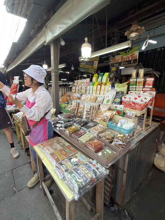 Once all 14 students had arrived, we toured the market to learn about rices, herbs, and seasonings. Before leaving, we chose our menus: appetizer, stir fry, soup, curry paste, curry, dessert, and beverage.