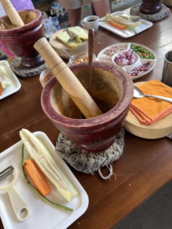 The “kitchen” was an open-air space with a bamboo-style roof and multiple cooking stations. Everything was prepped for us: knives, mortars, woks, and neatly arranged ingredients.