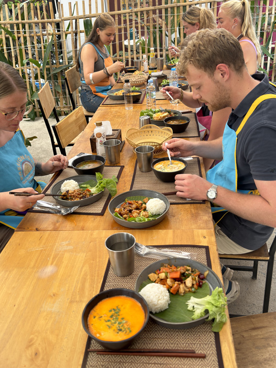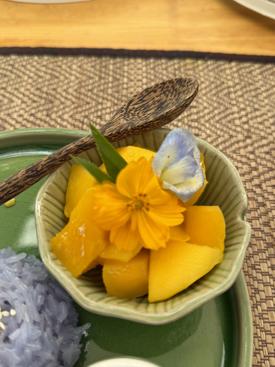 For dessert we all made mango sticky rice with either pandan or butterfly pea sauce, plus Thai tea. The teachers phoned our choices ahead to the farm so the assistants could prep our ingredients and tools.