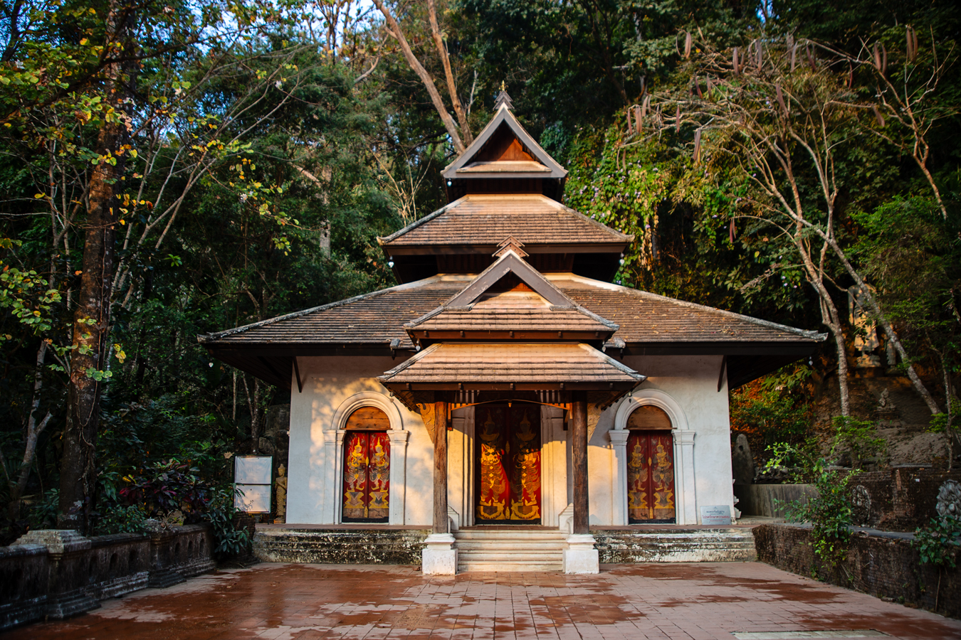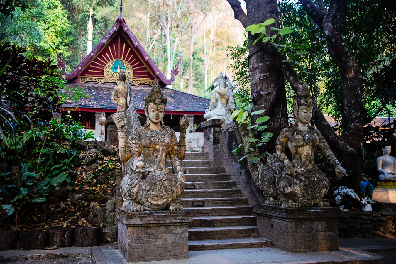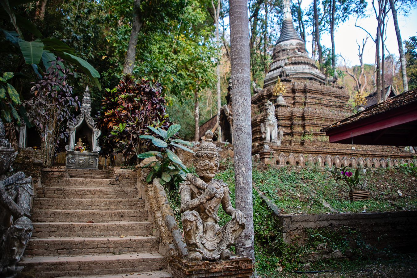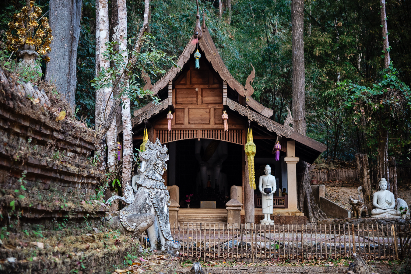 Located on the slopes of Doi Suthep, the temple is surrounded by dense forest and small streams, with occasional glimpses of the Chiang Mai skyline through the jungle canopy.