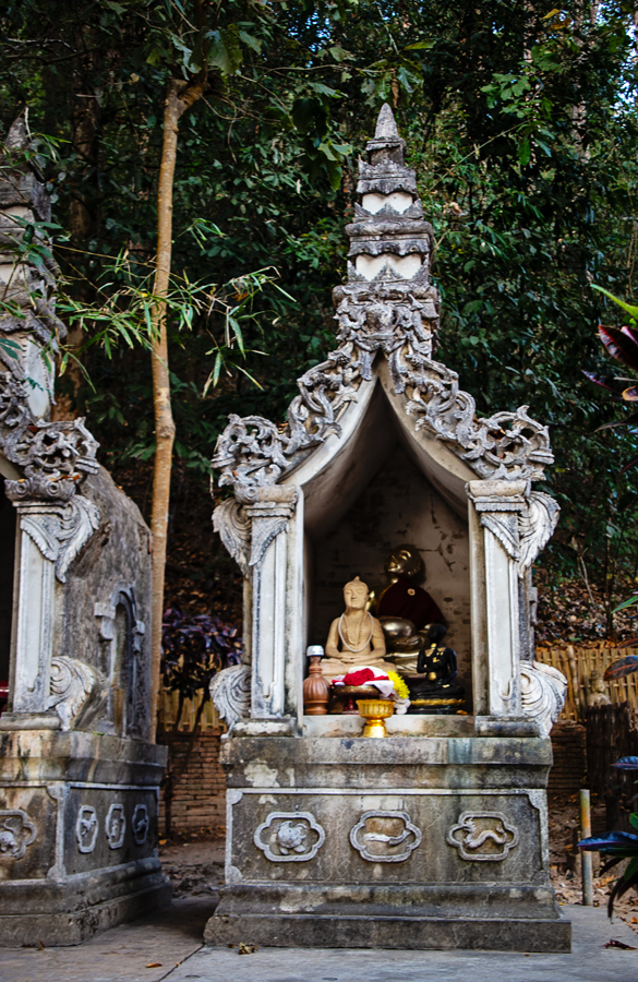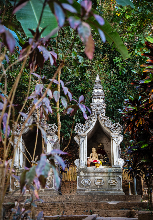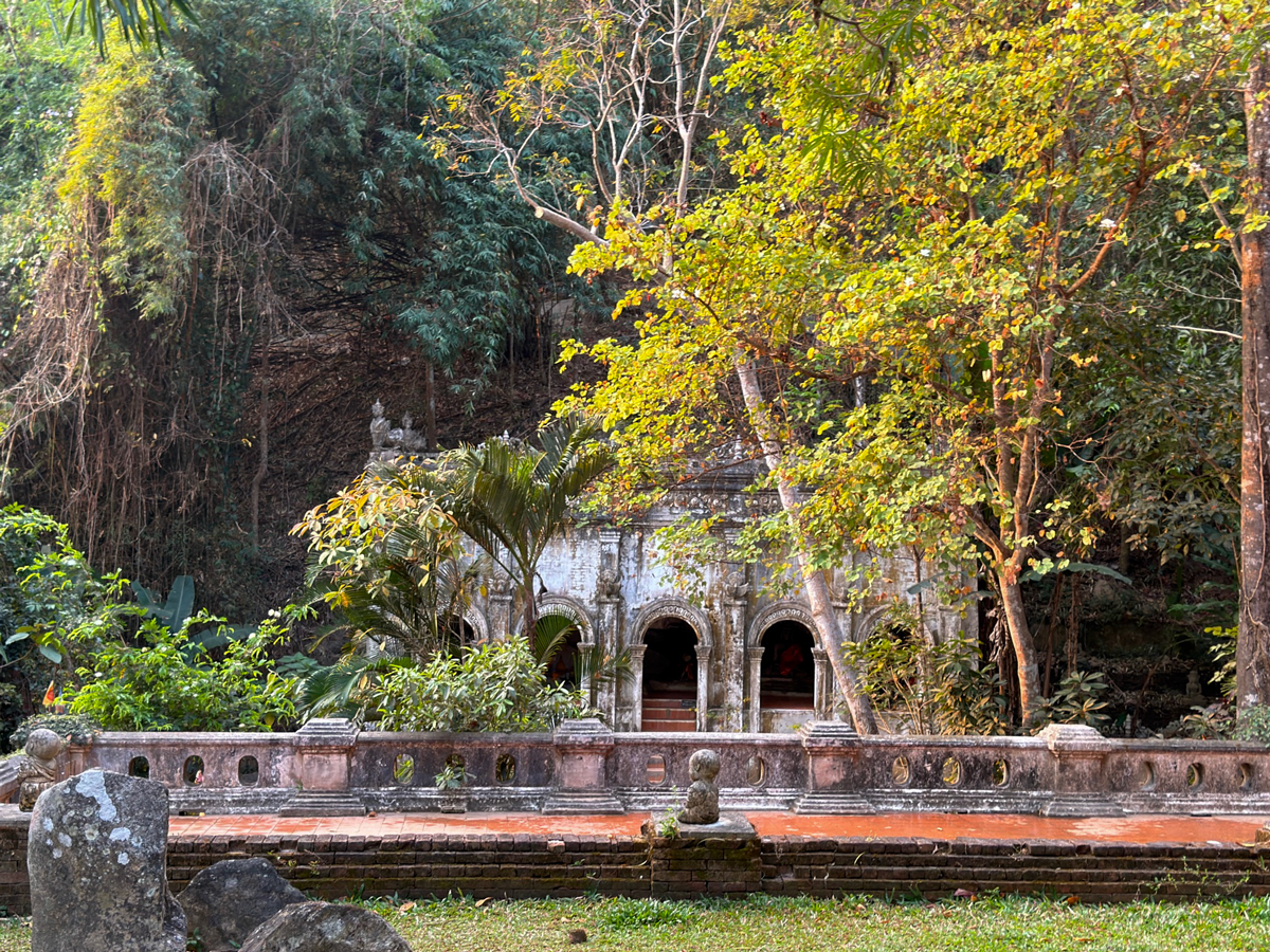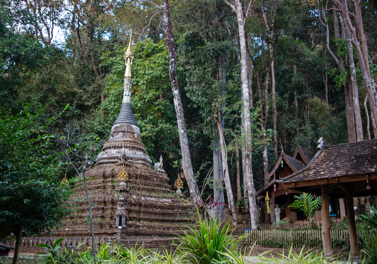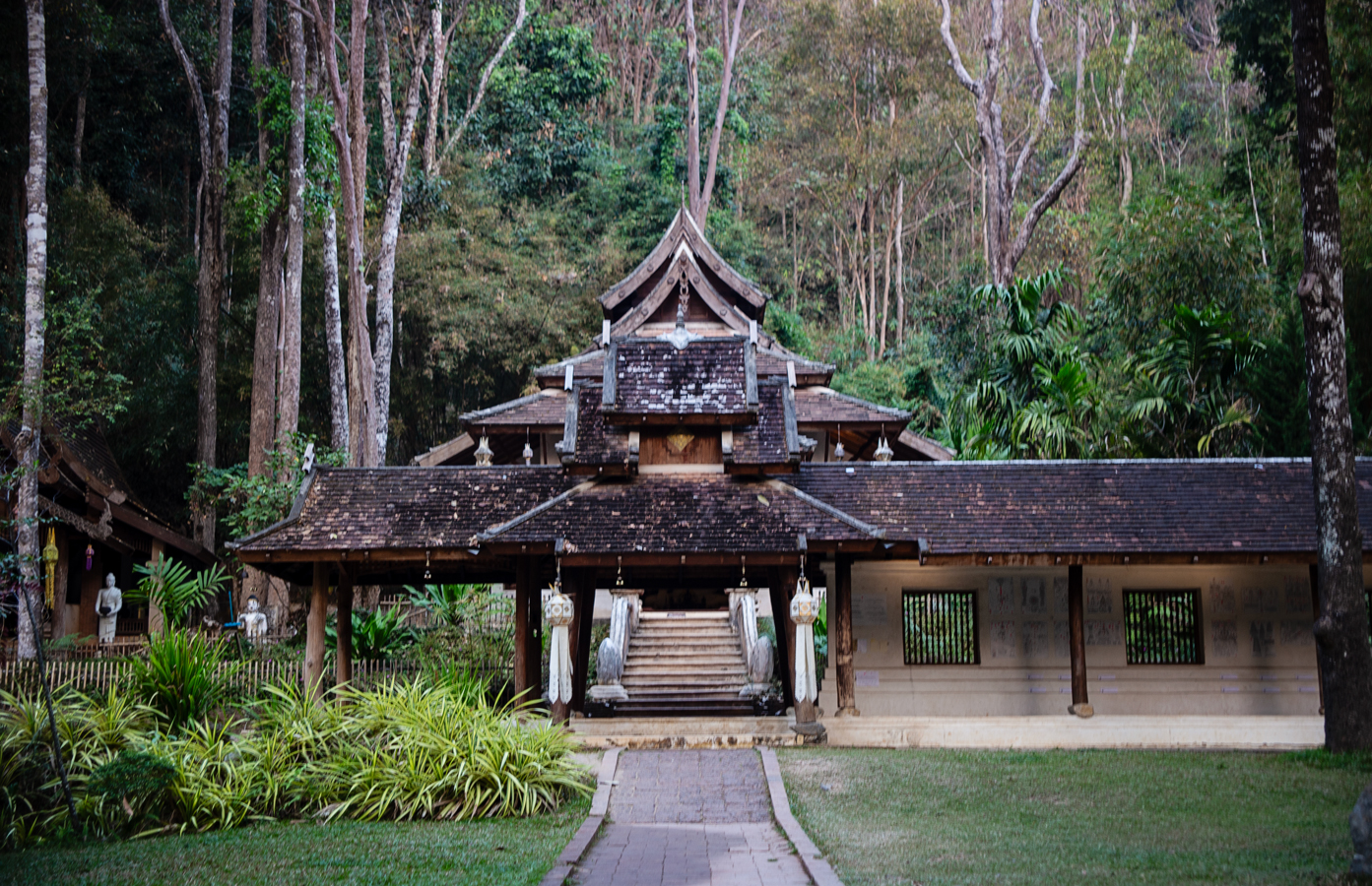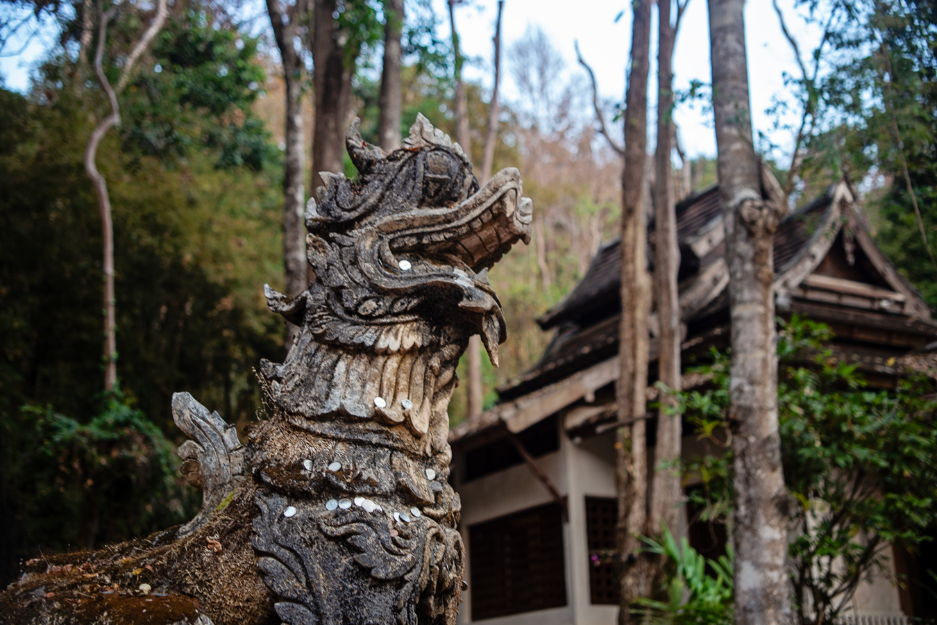Located on the slopes of Doi Suthep, the temple is surrounded by dense forest and small streams, with occasional glimpses of the Chiang Mai skyline through the jungle canopy.