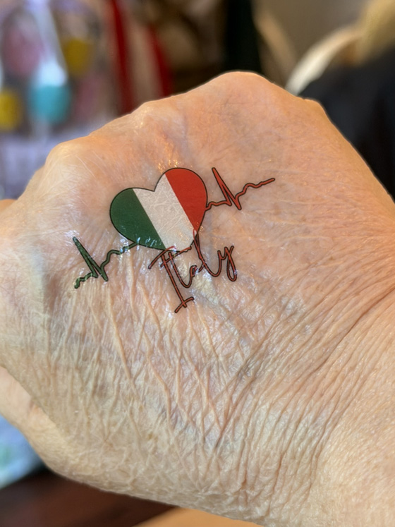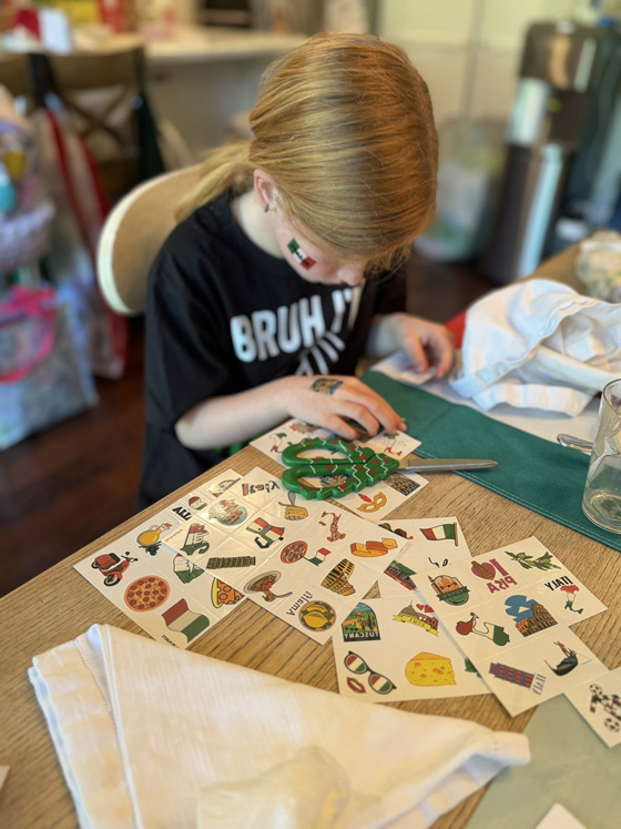 My nephew is very fond of his Italian mother’s tomato sauce, so he invited her to come for the day (she lives about an hour away) and teach my niece and great-niece her tomato sauce magic. The dining table was festooned with a red white and green table runner, there were Italian-themed tattoos and funny glasses to choose from, and a book of fun Italian facts. I took notes as the chef instructed her students, and then we all enjoyed dinner with the family sauce over ravioli, garlic bread, and plenty of Italian pastries.